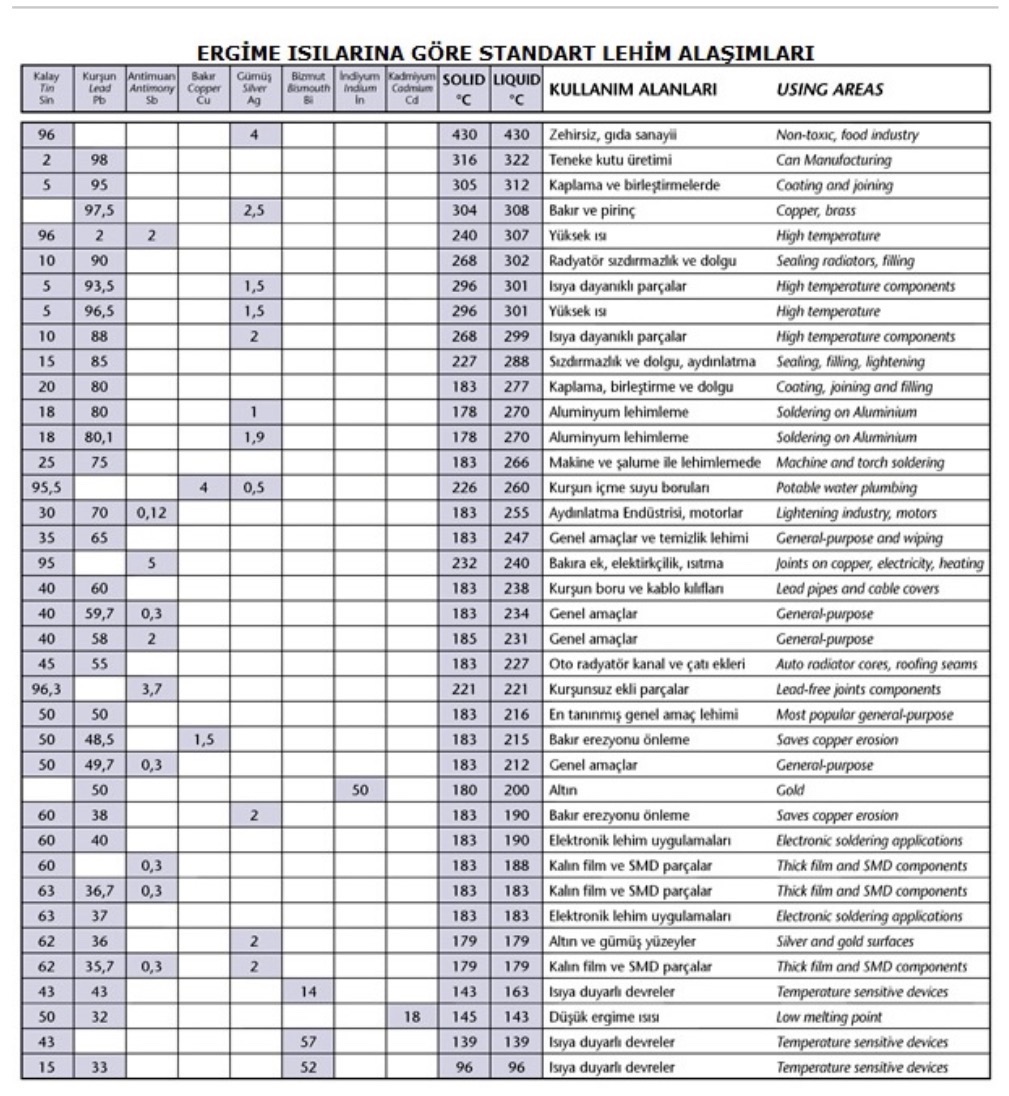 Lehim alaşımları, kullanım alanları ve proses değerleri için teknik referans.